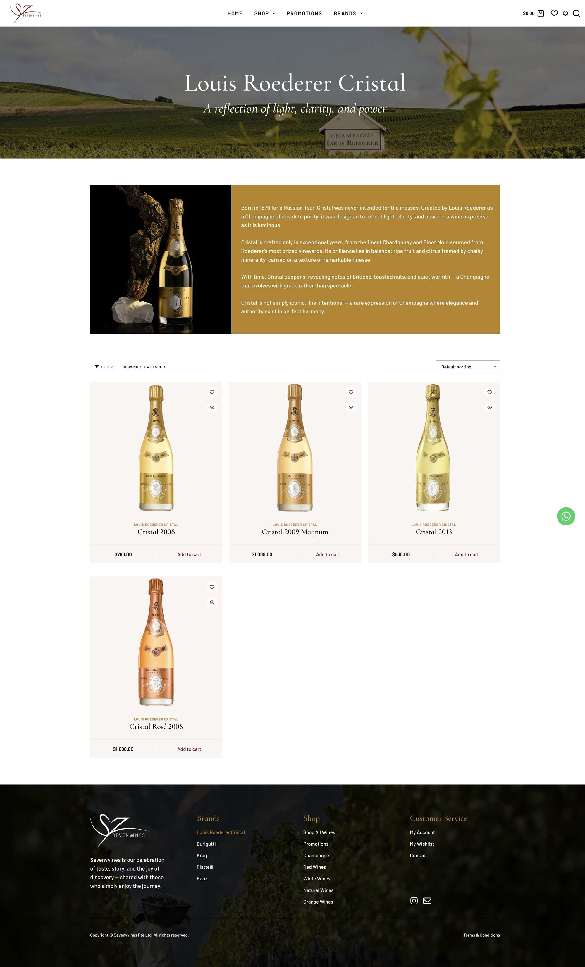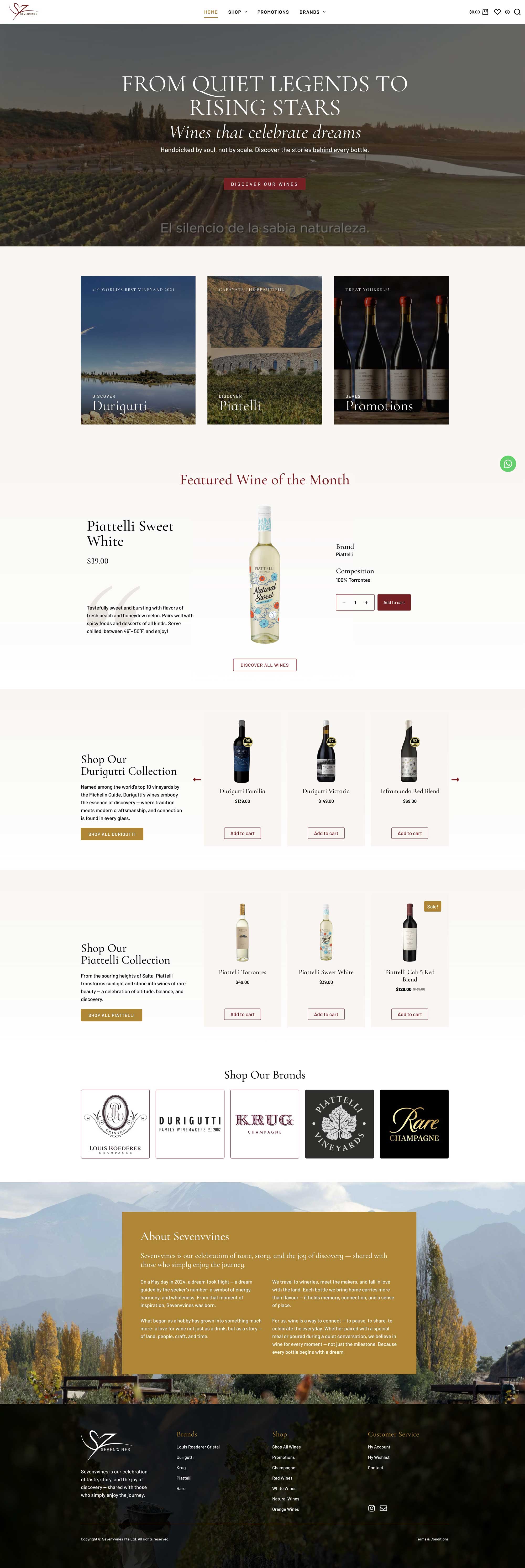 SevenVines is an online wine store looking to bring their collection to customers through a clean, easy-to-browse shopping experience. They needed a full e-commerce store where customers could explore wines by brand, find what they like quickly, and check out without friction.